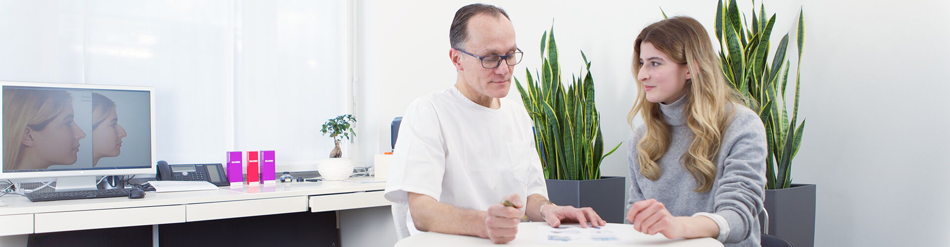 In der ersten Besprechung formulieren Sie Ihre Wunschvorstellungen. Sie können auch Fotografien mitbringen. Wir erörtern zusammen die Problempunkte Ihrer Nase und des Gesichtes.