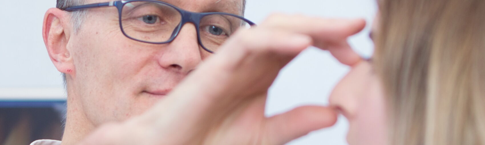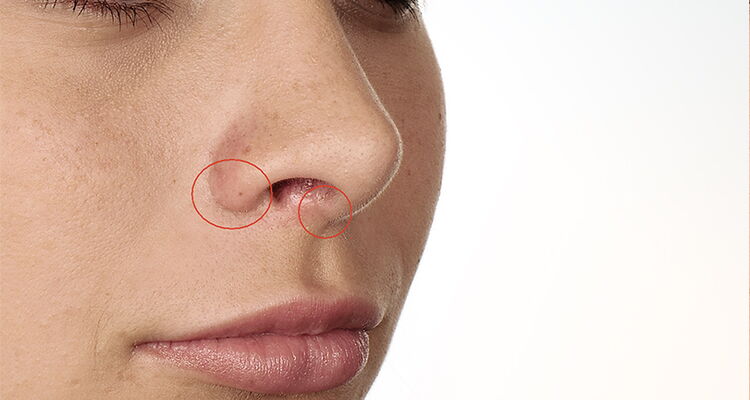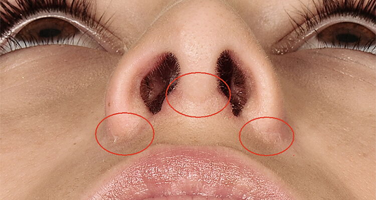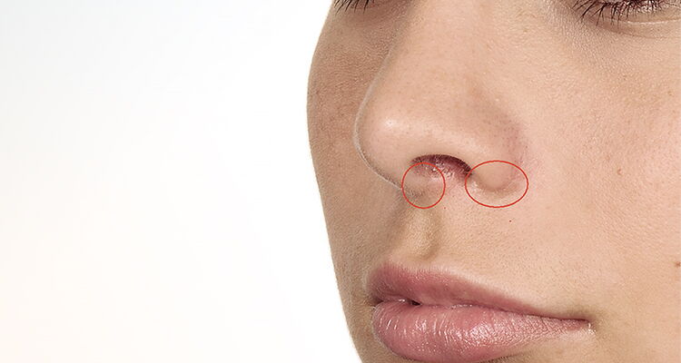 Einige Nasenoperationen erfordern einen Schnitt durch den Nasensteg, damit die knorpelige und knöcherne Nasenpyramide während der Operation dargestellt werden kann. Die rote Markierung im Bild umrahmt die Narbe im Bereiche des Nasensteges. Gelegentlich können im Rahmen einer verkleinernden Nasenoperation Zusatzschnitte im Bereiche der Nasenflügel notwendig sein, damit die Nasenflügel schmaler gestaltet werden können.